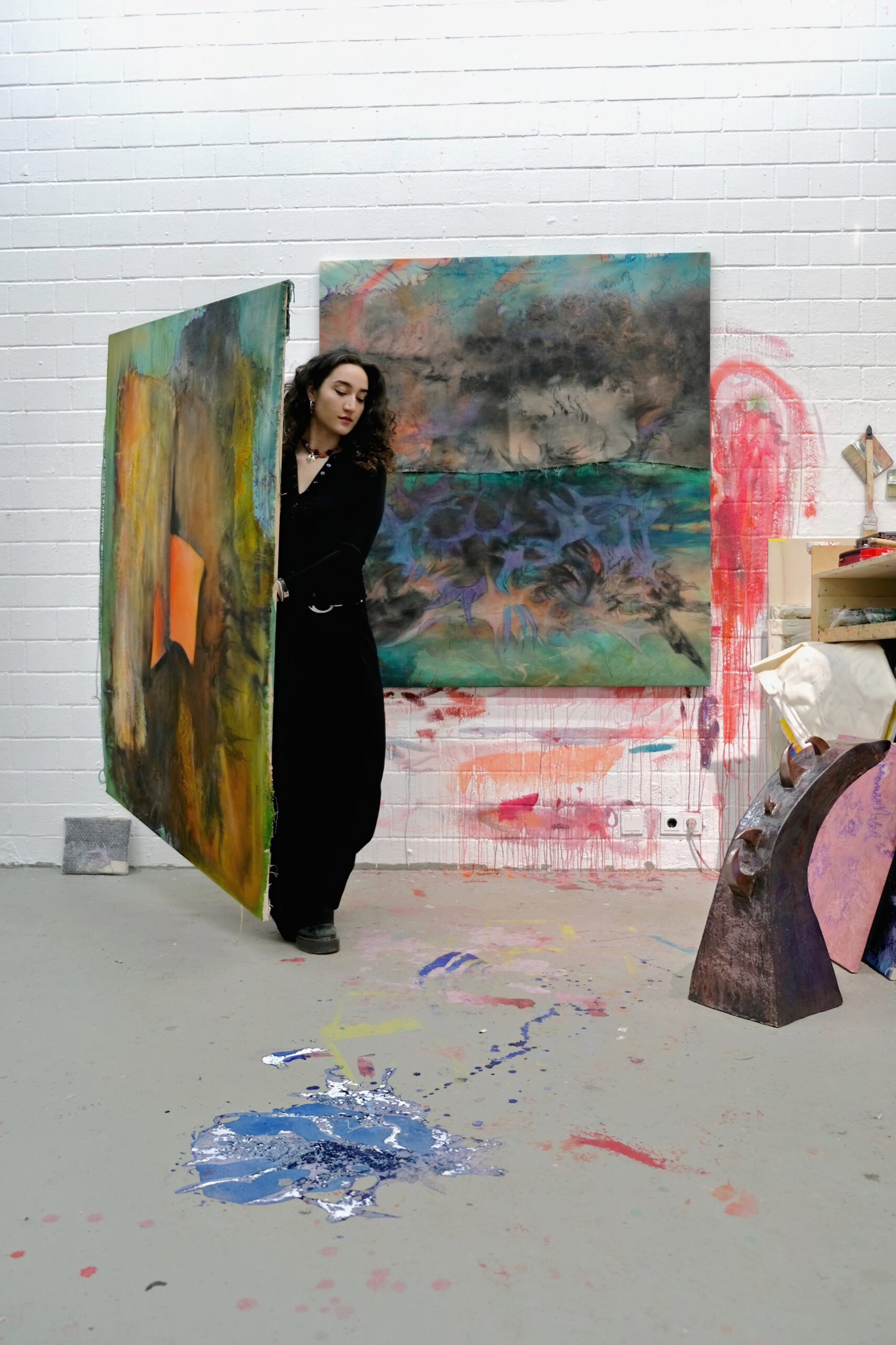 Diese Offenheit prägt auch den Dialog der Medien – Textilarbeiten beeinflussen Malerei und Skulptur gegenseitig und erweitern sich plastisch in den Raum hinein.